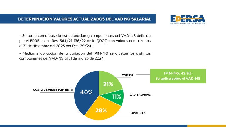 La solicitud de aumento fue expuesta por el gerente comercial de Edersa, Fernando Salice, quien enumeró las inversiones de la distribuidora durante los últimos cinco años y el impacto del proceso inflacionario en los costos operativos. Según la documentación que mostró, el incremento sería de un 8,5% en la tarifa media por el efecto del proceso inflacionario en el VAD no salarial, que es el componente con el cual la distribuidora afronta los costos de los materiales, servicios y suministros necesarios para desarrollar sus actividades.