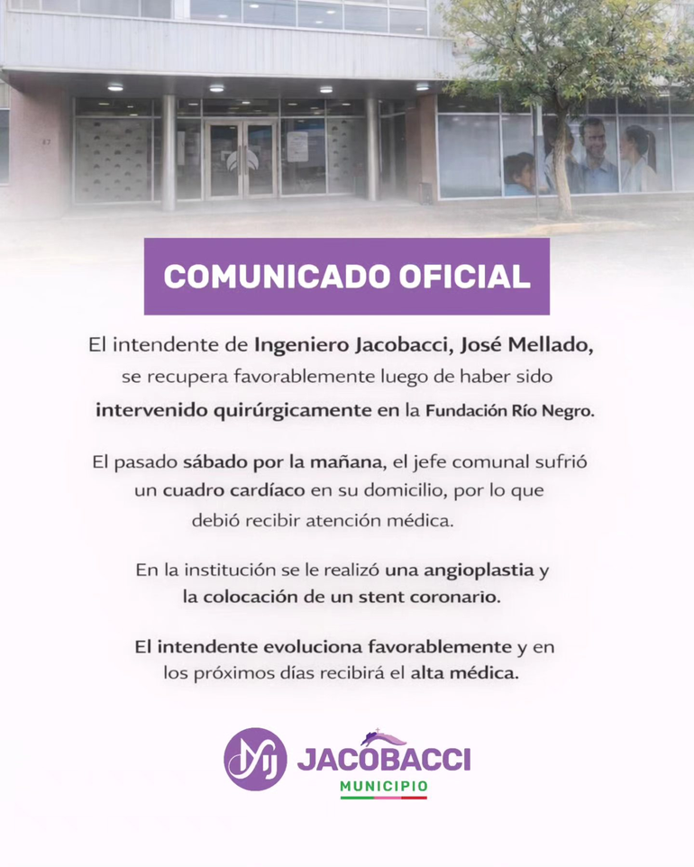 A través de un comunicado oficial, el Municipio de Ingeniero Jacobacci informó que el intendente se encuentra estable y evolucionando favorablemente luego del procedimiento.