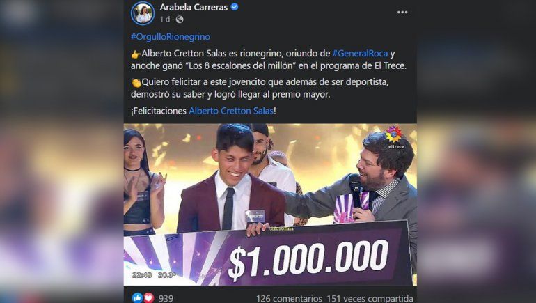 La gobernadora de Río Negro, Arabela Carreras, felicitó al joven roquense que ganó "Los 8 escalones del millón", el programa conducido por Guido Kazcka en El Trece. Se trata de Alberto Cretton Salas quien, además, es atleta paralímpico de alta competición.