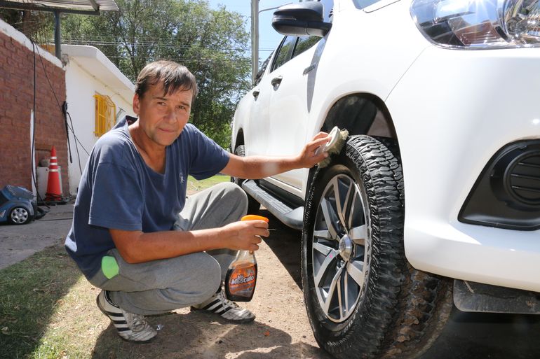 “Al principio vendí unos repuestos de autos que tenia Juan en la casa y con eso pudimos comprar la hidrolavadora y una aspiradora para limpiar los tapizados de los autos que me dejan para lavar. Por suerte tengo clientes y eso me ayuda para el día a día”, señala mientras le pasa el cepillo enjabonado a una de las ruedas de una camioneta 4x4.