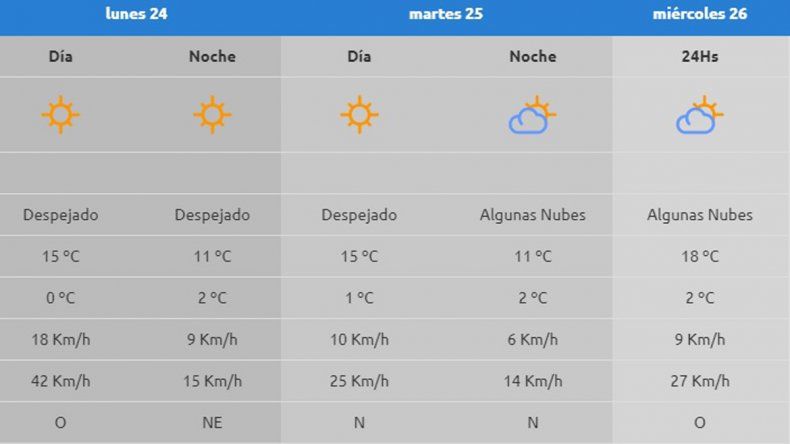 Según informó la AIC, para el lunes 24 se espera una jornada soleada pero con ráfagas de 42 kilómetros por hora por la mañana. La temperatura máxima será de 15 grados y la mínima de 0. Mientras que el martes 25 el cielo estará parcialmente nublado, con temperaturas similares a las del lunes pero sin viento.