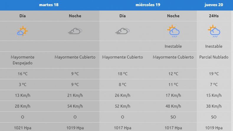 Si bien el lunes 17 nos recibirá con un día soleado, la temperatura máxima se sentirá recién por la tarde con 8 grados y una mínima de menos 2 grados bajo cero. Mientras que el martes 18 se espera un aumento de temperatura como así también la llegada del típico viento regional. Las ráfagas alcanzaran los 54 kilómetros por hora.