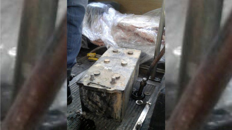 "Al momento de requerirle la información sobre su documentación, y la habilitación de transporte, se constató el interior del vehículo y se encontró una gran cantidad de costillares amontonados en el suelo", expresó Elifonso. Al lado de las bolsas se puede observar también una batería de gran dimensión con derrame de aceite.
