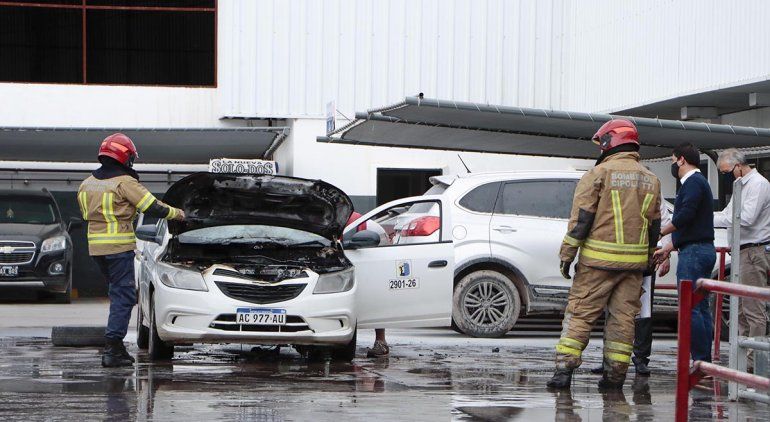 Por un desperfecto mecánico, un taxi se prendió fuego en el estacionamiento del supermercado La Anónima. El auto ya no sirve más.