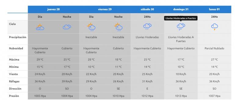 El miércoles se mantendrán estas condiciones con una máxima de 27 grados, algo similar a lo que ocurrirá el jueves cuando el termómetro escale hasta los 29. El viernes habrá un desmejoramiento que podría traer algunas lluvias en la zona, las tormentas se mantendrá durante el sábado y podría intensificarse el domingo.