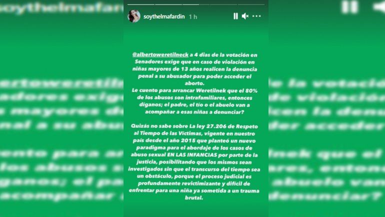 “Alberto Weretilneck a 4 días de la votación en Senadores exige que en caso de violación en niña mayores de 13 años realicen la denuncia penal de su abusador para poder acceder al aborto. Le cuento para arrancar Weretilneck que el 80% de los abusos son intrafamiliares. Entonces, díganos. ¿El padre, el tío o el abuelo van a acompañar a esas niñas a denunciar? Quizás no sabe sobre la Ley 27.206 de Respeto de Tiempo de las Víctimas, vigente en nuestro país desde el 2015 que planteó un nuevo paradigma para el abordaje de los casos de abuso sexual en las infancias por parte de la Justicia, posibilitando que los mismos sean investigados sin que el transcurso del tiempo sea un obstáculo, porque el proceso judicial es profundamente revictimizante y difícil de enfrentar para una niña ya sometida a un brutal trauma”, expresó la joven en su primera historia, a tres días de que se trate el proyecto de ley sobre el aborto en el Senado.