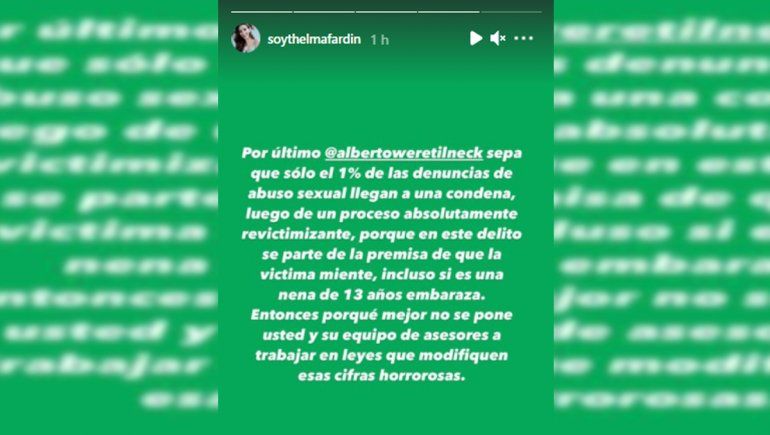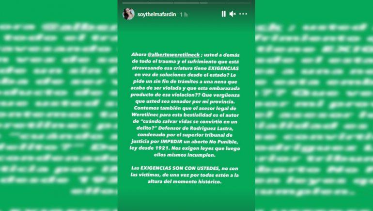 Lejos de quedarse allí, Thelma siguió: “Ahora Alberto Weretilneck; usted además de todo el trauma y sufrimiento que está atravesando esta criatura tiene EXIGENCIAS en vez de soluciones desde el Estado? Le pide un sinfín de trámite a una nena que acaba de ser violada y que está embarazada producto de esa violación. Qué vergüenza que usted sea senador de mi provincia”.