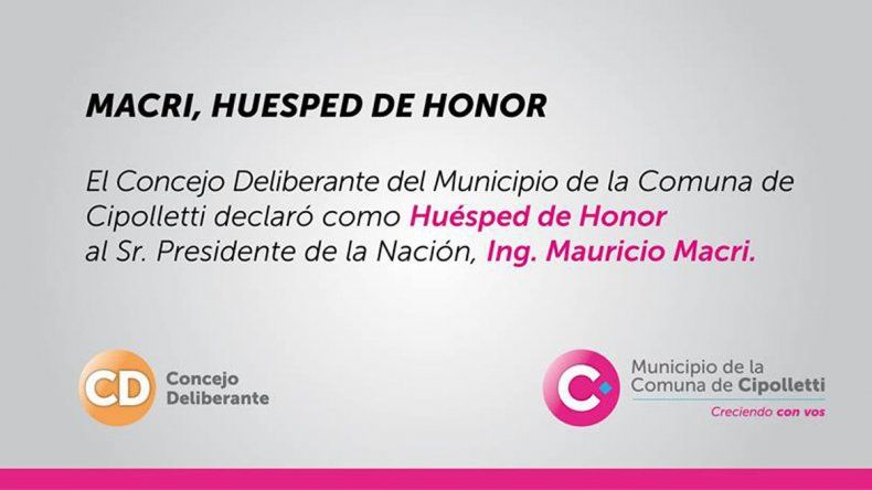 El Concejo Deliberante de la ciudad de Cipolletti declaró al presidente como huesped de honor. Así lo hicieron saber a través de un comunicado.