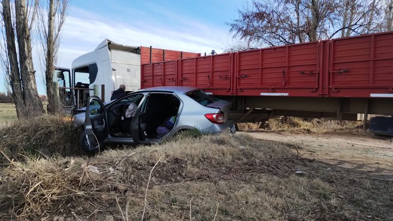 Tras el impacto el auto y el camión quedaron a la vera de la Ruta 65, en el ingreso a una chacra. Una parte de la carrocería del rodado menor quedó bajo el semi del camión, suspendido sobre un desagüe rural. Una ambulancia trasladó a los heridos hacia el hospital de Fernández Oro.