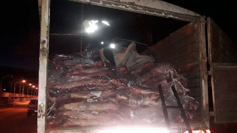 El hecho ocurrió hoy alrededor de las 7 en el control de la Policía ubicado en Puente Dique, en Catriel. Allí los efectivos que realizaban el control de rutina frenaron a un Mercedes Benz modelo LS1112 tipo chasis con cabina color azul con caja blanca dominio VSC046 que era conducido por un hombre de 37 años oriundo de la ciudad de Centenario. Cuando se revisó el interior, los uniformados encontraron que transportaba cajas con costillares, cuartos, paletas carnes rojas bovinas con hueso envueltas bolsas nailon transparentes. El peso total de la mercadería ascendió a los 10 mil kilos.