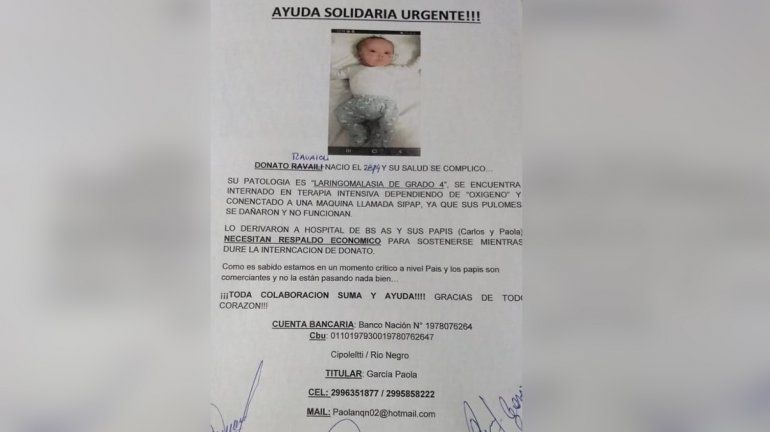 La mamá de Donato explicó que, de acuerdo a la información brindada por los profesionales médicos, el nene debía recibir tratamiento en Buenos Aires o Córdoba, ya que en la provincia no se realizan operaciones de laringomalacia en bebés. "En Neuquén hay un médico que lo hace, pero para nenes más grandes desde dos o tres años. También está en juego el hecho de que no sabemos si hay que operar uno de sus pulmones", indicó.