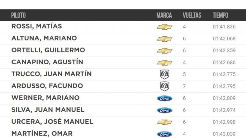 Así, con un registro de 1m42s998, se metió noveno, aunque lejos de Matías Rossi. El piloto de Chevrolet le está haciendo honor a su apodo, Misil, en Concordia: bajó el récord histórico del circuito y apenas seis pilotos quedaron a menos de un segundo. El registro, 1m41s836, lo coloca como el gran candidato para mañana. Sin embargo, Mariano Altuna y Guillermo Ortelli, segundo y tercro, se ilusionan con poder arrebatarle el primer lugar de la grilla durante las series, ya que Rossi correrá en la primera, con peores condiciones de pista.