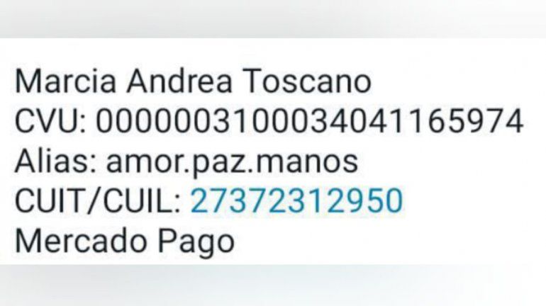 La gente puede colaborar con la causa a través de una cuenta en Mercado Pago.