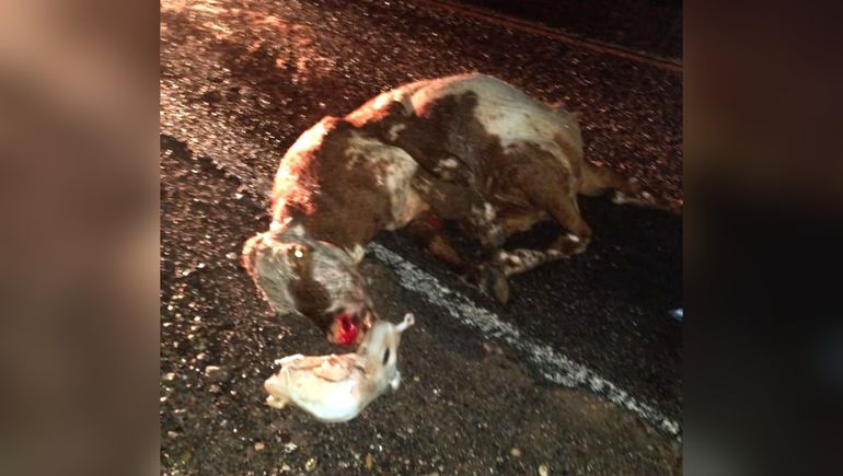 Una vaca preñada fue violentamente atropellada este miércoles a la madrugada por un Citroën C4 en la Ruta Provincial 5, a tan solo 25 kilómetros de Rincón de los Sauces. Tanto ella como el ternerito que llevaba en su vientre murieron. El auto se prendió fuego y sufrió importantes daños materiales. El conductor resultó ileso.