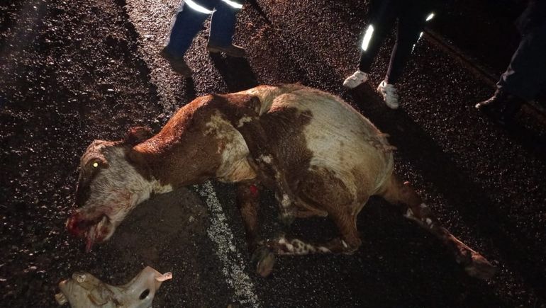 Vaca preñada murió atropellada en la ruta: el auto se prendió fuego