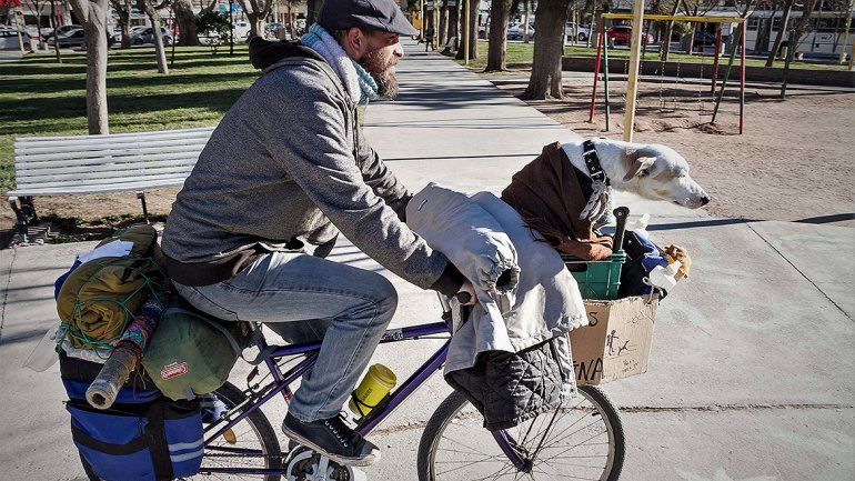 El miércoles llegó a Cipolletti en bicicleta con un canasto improvisado sostenido del manubrio en el que se recuesta su perra. Detrás lleva la carpa, la bolsa de dormir y algunos elementos indispensables. Él viste jeans gastados, una boina y barba, saluda a quienes lo miran y sonríe, con actitud de socializar de forma rápida. “Un día, hace 7 años, estaba en Purmamarca y conocí a unos chicos que se iban a Cartagena, Colombia. No tenía planificado nada, llamé a mis jefes y les pedí licencia. Hasta ahora no paré de moverme”, recordó Aníbal.