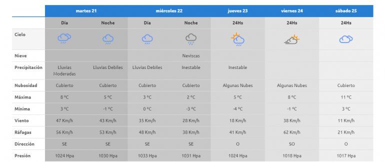 El jueves se presenta inestable, con posibles lluvias y frío, según el reporte de la AIC. Mientras que el viernes vuelve el sol pero llega el viento con ráfagas de hasta 63 kilómetros por horas. Durante todos estos días las máximas no superaran los 8 grados, mientras que las mínimas estarán bajo cero.